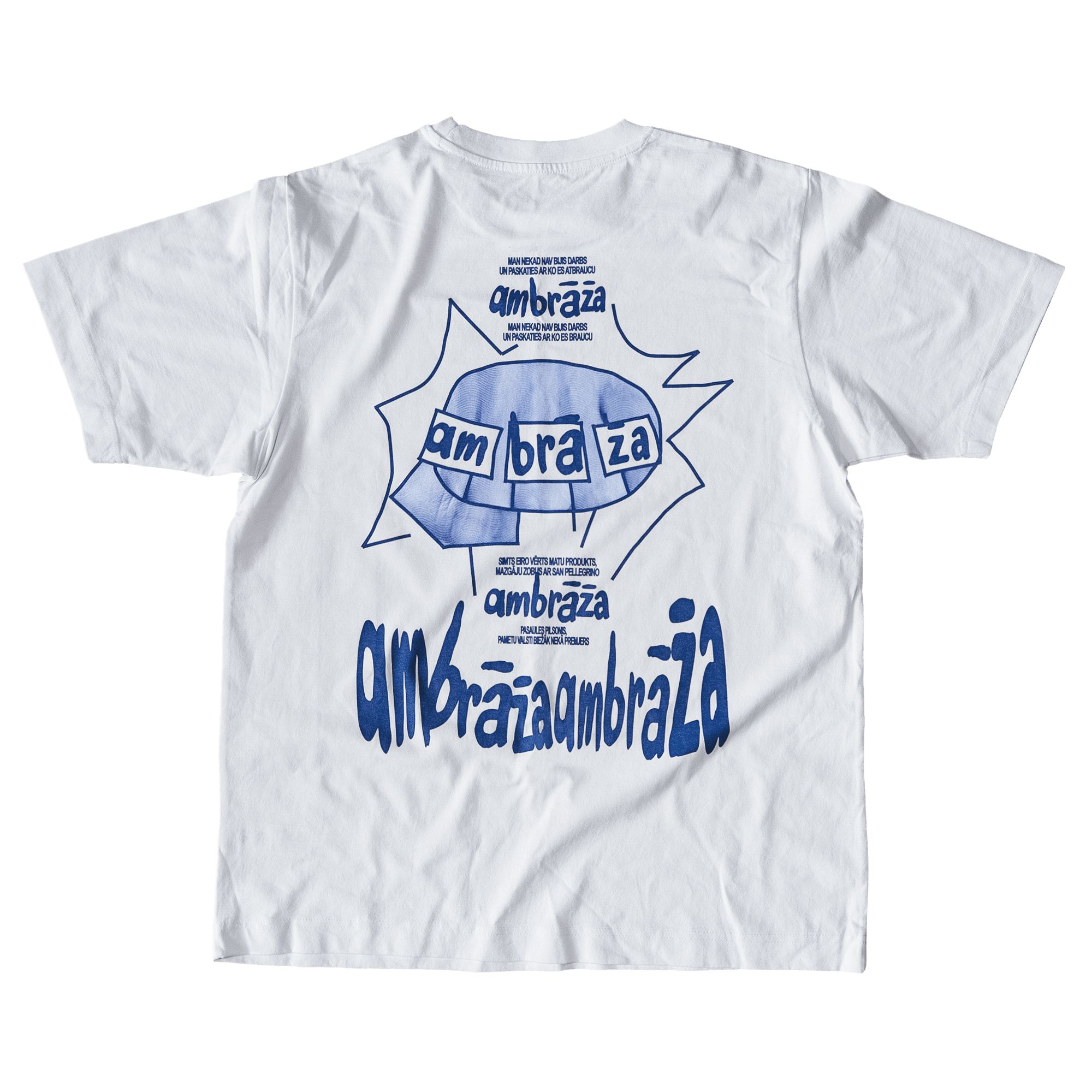 "Ambrāža" tee in white with a customized +K logo on the front and a graphic on the back. Made in honor of galeniex & reivs EP released in the summer of 2025.